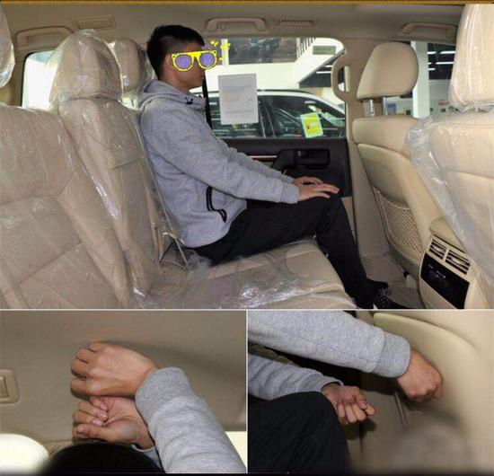 同位体验者保持第二排座椅不变坐入第三排,头部空间局促,腿部空间为一拳,只能应急使用。