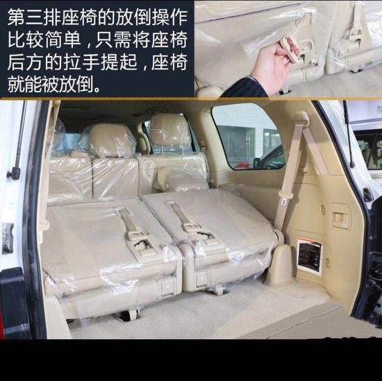 第三排座椅的放倒操作比较简单,只需将座椅后方的拉手提起,座椅就能被放到。