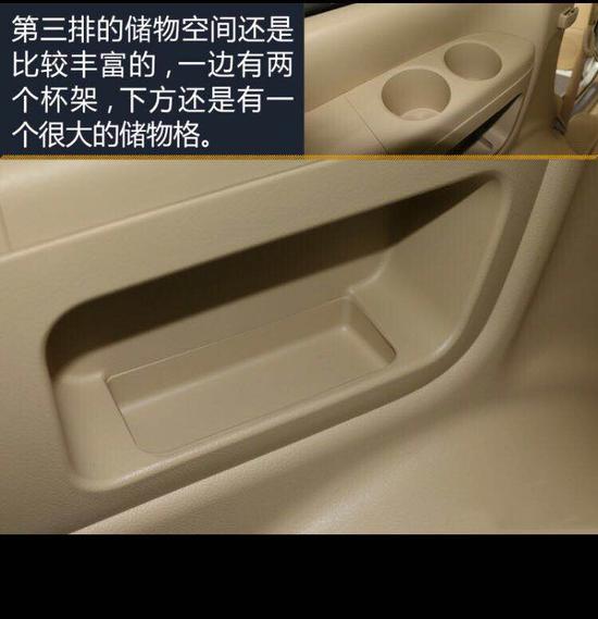 第三排的储物空间还是比较丰富的,一边有两个杯架,下方还是有一个很大的储物格。