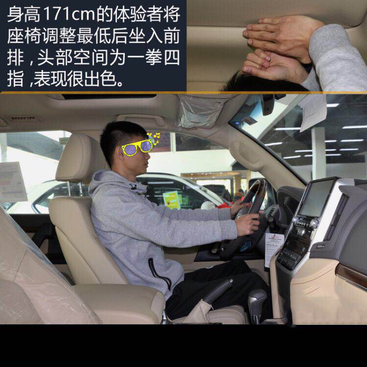 身高171CM的体验者将座椅调整最低后坐入前排,头部空间为一拳四指,表现很出色。