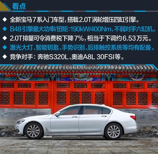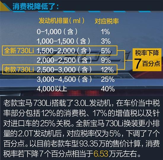 以老款宝马7系 (配置|询价)为例,同为低配领先型,730Li的官方指导价(93.35万元)要比740Li(122.35万)低上近30万元。因此对于喜欢宝马7系的朋友来说,购买入门车型还是很实惠的。此次全新730Li换装了更小排量的2.0T发动机,除了能让车价有了下探的空间,消费税率也会从12%下降至5%,无疑会让该车价格更有竞争力。