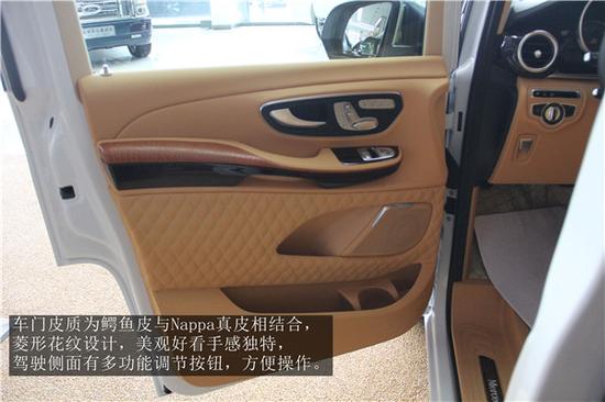奔驰V260L乘客舱第二排总裁级航空席,真皮软包,带旋转、按摩、通风、加热等调节功能,均可通过扶手侧边的功能模块实现一键电动操控。迈巴赫菱形格纯手工缝制,采用激光打孔技术奔驰V260L秉承一贯人性化的设计理念,倾力打造航空舱式优雅舒适的乘坐环境。