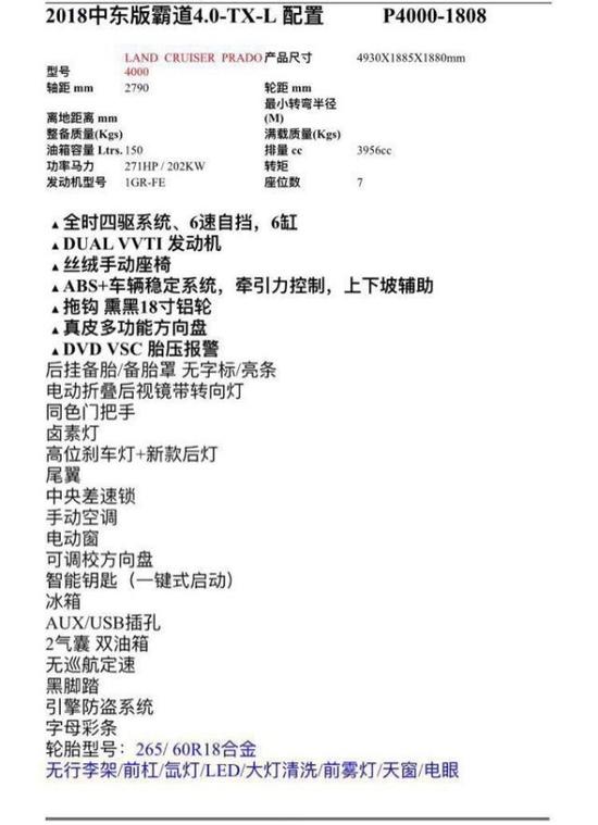 18款霸道4000 九气囊标配 白色62 黑色61.4详细配置: