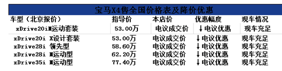 近日,笔者在进口宝马经销商处店了解到,店内正在举行周年促销降价活动,店内全新宝马X4 (配置|询价)均以团购价钱回馈新老客户,店内为完成厂家销量任务,取得厂家返点,经厂家授权,销往全国,现有2016款宝马X4-33台全系优惠大促销(最近两个月内全新商品车),最高可优惠31万,现店内现车充足,颜色齐全,销售全国,无区域限制,手续齐全(发票,合格证,车辆一致性证书,PDI检测证书,保养手册,三包凭证)全国各地均可落户上牌,全国联保,提供接站服务,所有手续随车走,购车有价值万元的大礼包赠送,来店购车无任何附加条件,欢迎各位车友到店详谈!2016款宝马X4优惠详情请看下表:考虑到外地车友到京购车路程远,凡来本店购车成功的车友,均报销两人单程路费(3000元以内含飞机票,火车票,大巴车)。购车咨询热线在文章下方,详情来电咨询!