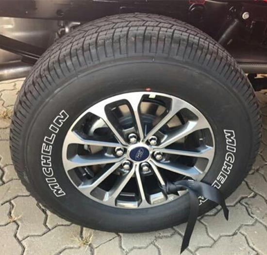 18款福特F150 3.5T的轮毂最为独特,新车最新的轮毂是把可靠的传统轮毂和防脱圈的轮毂结合起来了。这款防脱圈轮毂可以保证在轮胎气压较低的情况下,轮胎不会脱离轮毂,因为我们去沙漠的时候往往要降低胎压。并且它从传统轮毂转换到防托圈只需要客户拔去标准螺栓,从其常规位置卸下轮胎然后从可锁位置重新安装轮胎,再装防脱圈螺栓即可。