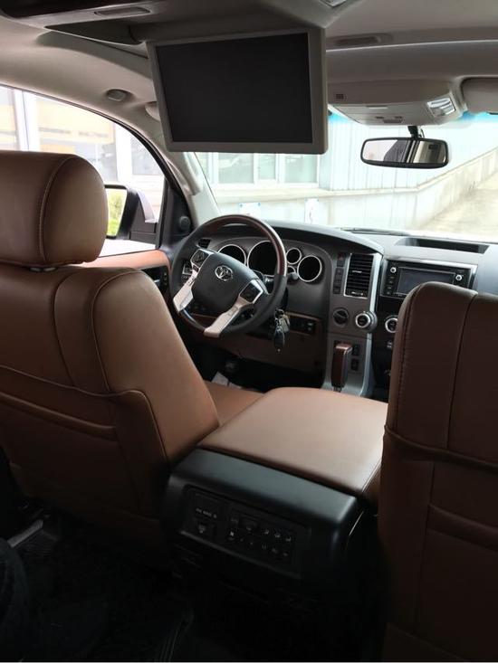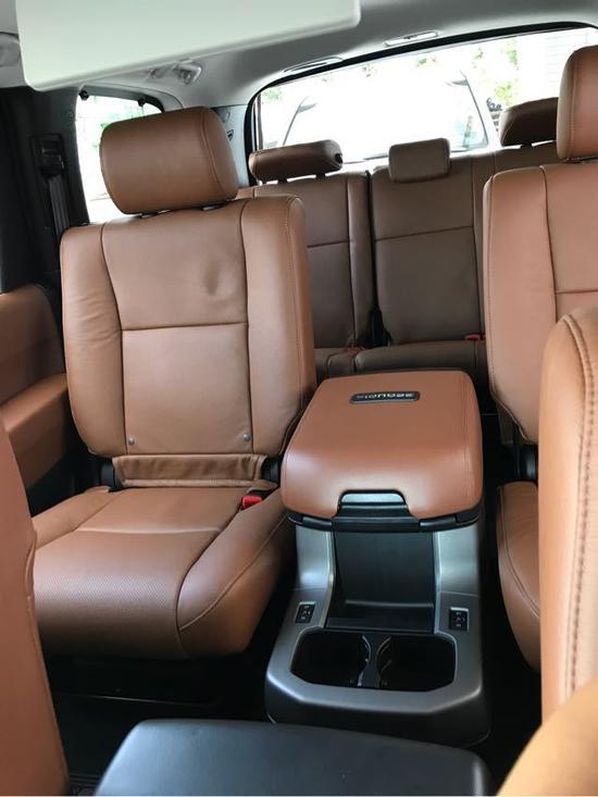 新款丰田红杉5700内部空间采用了符合人体工学的设计理念,同时还应用了高品质的内装材质,中控台被银色和黑色分割成了两部分,从而让驾驶者更方便操控。丰田红杉带有桃木内饰装饰,包括细节的方向盘和换档把都是桃木的,而且带有原装的大屏导航和倒车影像,带有底盘升降控制。多功能真皮桃木方向盘可以控制定速巡航音量加减以及蓝牙电话和ACC雷达测距系统。主副驾驶都带电动调节,座椅带有前后加热和前通风功能。