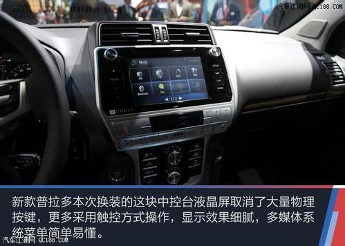 18款丰田霸道2700TXL中控台采用直立式设计风格,立体感十足,各个按钮触手可及,非常符合人体工程学。多功能方向盘手动上下、前后可调,采用真皮材质,车内整个布局合理紧凑。四幅方向盘加入了银色装饰条,使得整体感觉更有活力。