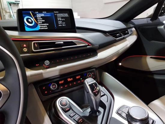 全新进口宝马I8混合动力跑车造型前卫,标配车型采用名为优雅型内装,采用浅色搭配,而大部分材料均以橄榄叶提取物制成。以驾驶者为中心是BMW车型内饰的特有设计原则,尽可能采用轻量化可再生原材料,动感十足。中央控制台朝驾驶者倾斜。所有仪表和带有两个大型显示屏的数字式液晶仪表板易于操作。所有乘客的座椅位置都较低,包裹性极佳的轻质座椅即便在快速转弯时也能提供可靠的支撑和卓越的舒适性。iDrive控制旋钮仍然位于中央控制台上便于操作的位置,看上去就像把车内划分为左右两个区域。层次化的设计原则使功能性和清晰的构造方式以一种全新的方式和谐地融合在一起。迎宾踏板中的可见碳纤维元素突出了BMW i8的低重量特点。