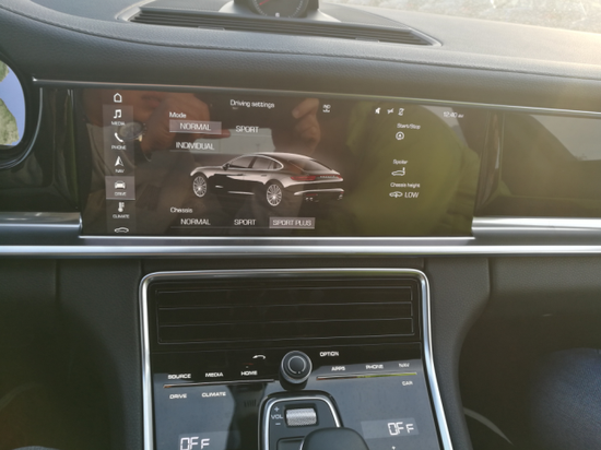 内饰方面:保时捷帕纳梅拉五环式仪表盘,具有液晶显示屏的行车电脑显示功能,超大液晶显示屏配有倒车雷达模拟图像。还有可以在每个弹簧中按需提供额外充气量的气动悬挂系统,可自动升起且角度可调的后扰流板,确保了主动空气动力学性能。