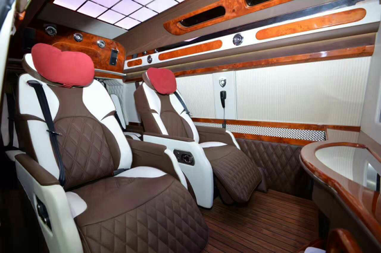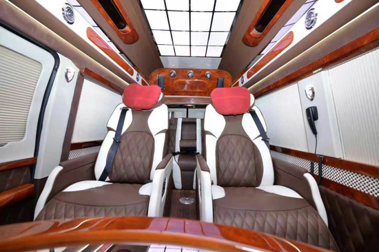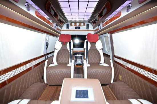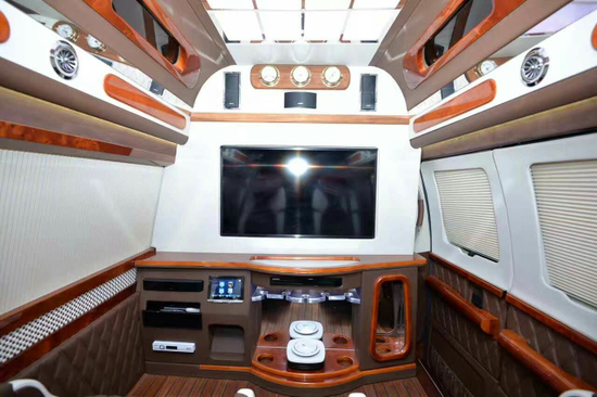 福特E350带有按摩功能的航空座椅,舒适度爆表。各位土豪坐在这样的座椅上,品着红酒,听着优美的影音,和自己的朋友感悟着人生。这是件多么惬意的事情啊。奢华的游艇木,高端的极品头层水牛皮,高级工匠手工缝线,这些组成了几近完美的吧台。吧台下方是一套高级音响。行驶在公路上会带给土豪坐在游艇中畅游大海上的感觉。ERWIN SATTLER的船钟更是将车厢内的奢华感拉升了一个档次。走时准确,样式精美,古朴的外观透露着浓浓的奢华气息。依旧是高端的游艇木,依旧是抛光的镀铬,浅色的爱马仕认证真皮地板。这一切的一切构成了奢华无比的氛围。