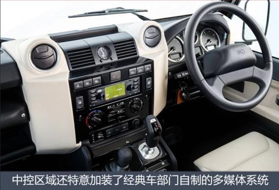 内饰方面:路虎卫士Works V8采用了黑白双拼的主题配色,使其看起来时尚充满个性。Recaro运动座椅、中控台、门板以及顶衬等多处细节都用真皮材料进行包裹,同时路虎经典车部门还为这款新车装置了自己研制出来的多媒体娱乐系统。此外,随着动力提升,新车的挡杆也变为了电子挡杆,同时上面也镶嵌了路虎品牌70周年特别版标识。