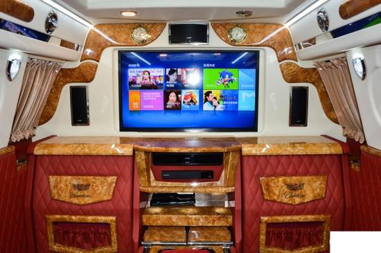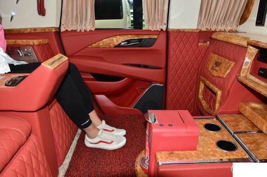 凯迪拉克总同一号内部为4 2座计划,前排为电动折叠座椅,座椅收起跟中央多功效实木吧台融为一体,构成更大吧台。后排为2个自力的电动推拿座椅带 透风、加热 推拿 腿托 靠背放同等。搭客舱悉数的电器扫数集成在后排座椅中心小吧台的屏幕上,操作轻易简单。全车都采取酒赤色真皮包裹,档次和奢华水平无可相比。平安方面,防弹后尾门为您保驾护航。