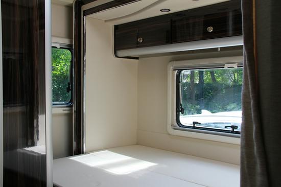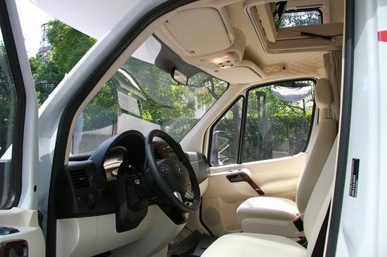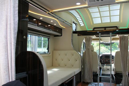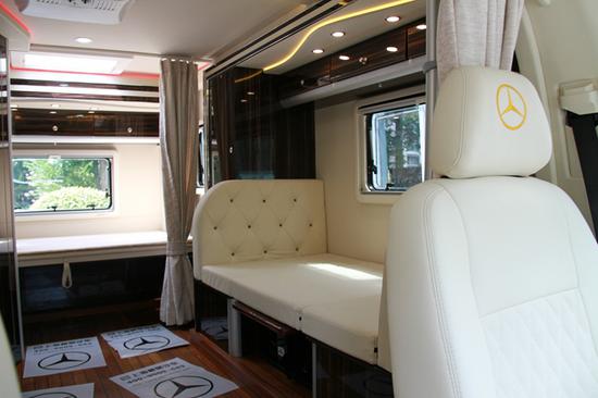 前后舱未隔断,设置了隐私门帘。奔驰24T房车,全车搭载3张可变床,驾驶舱顶置双人大床。