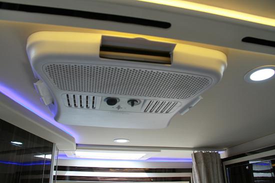 将顶铺上翻后是隐藏式液晶电视,此外,奔驰房车24T车外也载有电视及音响,以供夏季户外使用。可接收卫星电视、播放DVD,以及MIC输出,搭载全车环绕音响。