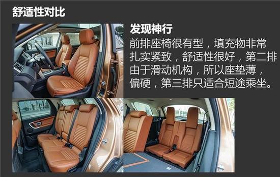 发现神行因为要容纳第三排座椅,所以它的轴距是三款车中最长的,另外前文说到车顶平直,这对于提升头部空间也有很大帮助。第二排座椅可以前后滑动,目的是为了让第三排乘客可以有更多的腿部空间。不过滑动机构让座椅变得很薄,比其他两款车更硬。第三排座实际上更多时间只是为了儿童乘坐,成人坐在这里比较憋屈,头部和腿部均是如此。不过从第三排座椅提供独立空调系统、杯架储物盒以及USB接口来看,路虎并不希望它成为摆设,舒适性配置还是很全面的。值得一提的是,这款车的第二排空调风量和温度控制均是由前排操控。