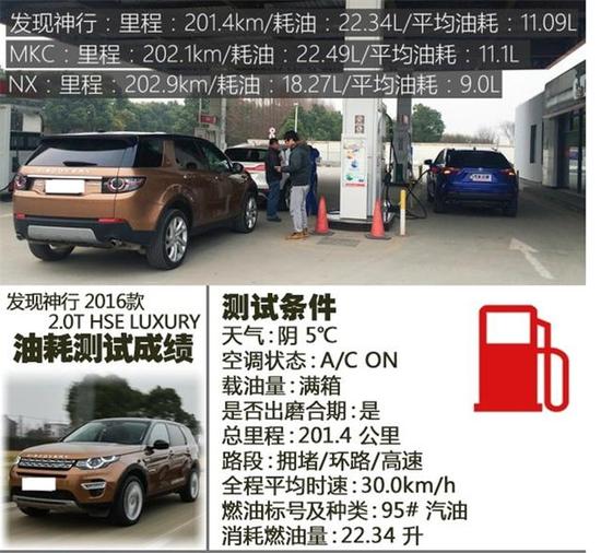 同为2.0T发动机,在累积行驶超过200km之后,我们对这三款车进行了油耗总结,其中发现神行共行驶201.4km,消耗燃油22.34L,百公里平均油耗为11.09L,MKC行驶202.1km,消耗燃油22.49L,百公里平均油耗为11.1L,NX行驶202.9km,消耗燃油18.27L,百公里平均油耗为9.0L。从成绩上我们可以看出,雷克萨斯这套动力系统的效率还是非常高的,不仅性能不错,油耗也保持在三款车中的最优水平。另外两款车虽然比雷克萨斯要高2L多一些,但对于这类车来说,这个油耗成绩是可以接受的。