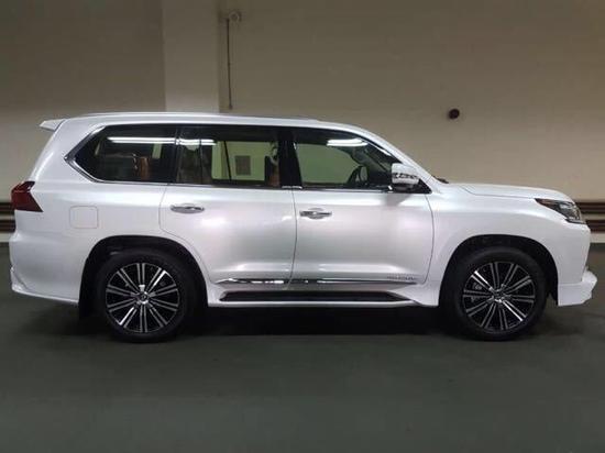 雷克萨斯LX570 18款 八座 S 限量 中东现车|白/棕|手续全随车发 配置:金属漆 ,黑色前中网 ,前后大包围 ,射灯 ,21轮 ,遥控启动 ,车身防擦条, 流水式转向灯,外置拖钩,带运动底盘,运动模式,换挡拨片、冰箱、天窗、智能卡、电眼、环影、后排娱乐、底盘升降、前座椅通风加热(真皮)、导航、桃木多功能方向盘、桃木内饰、铝制行李架、航空照明脚踏、LED 氙灯 大灯清洗、迎宾灯、四区空调、三排电动、电尾门、拖车钩、ACC自适应巡航、雷达测距、后座椅通风、车道保持、二排遮阳帘、抬显、马克莱文森音响