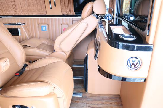 新款进口大众四驱T6内置奢华配件,空间宽阔。木质地板,独特吧台,下置冰箱,电器灯光触摸屏控制。可升级调节液晶电视,两侧各有航海钟,内含温度计、湿度计。两侧也各置储物柜,形成中国古典的左右对称设计理念。壁灯、氛围灯、吧台灯,照亮整个车箱,即使在漆黑的夜晚,也同样“熠熠生辉”。