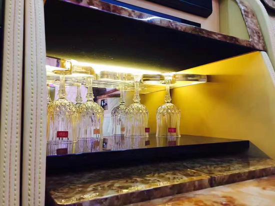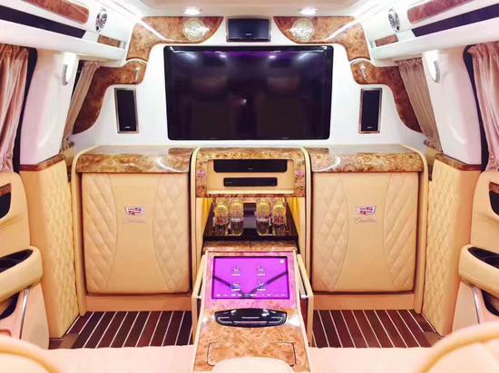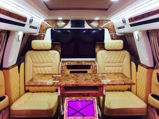 总统一号的折叠座椅打开图片,它的上方是40寸超大电视,带有网络系统。总统一号内饰宽敞,全车采用真牛皮包裹座椅,座椅柔软舒服,人体学上可以说总统一号座椅是最理想的,人坐在上面,不一会舒服得想睡觉。总统一号内饰配置的办公电脑桌板,电动升降带有折叠功能