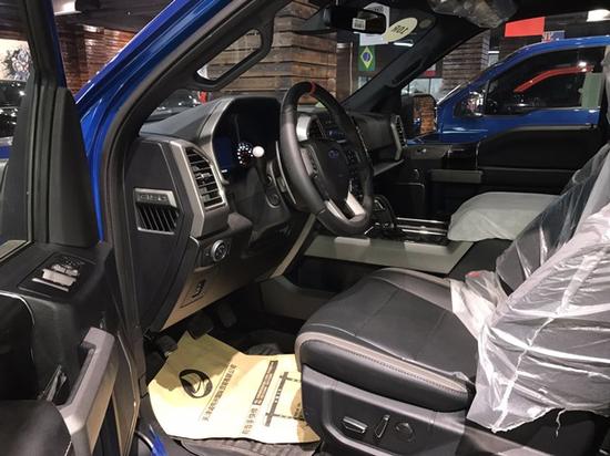 福特猛禽F150内饰采用独特的中控台和门饰板面漆和真皮包裹的方向盘。中控台部分辅以银色饰板装饰,六指针仪表盘的设计有些后工业时代的复古风格。采用带电冷热功能的可记忆式皮革座椅,头枕四向可调,搭配铝饰条和黑色钢琴烤漆内饰。可电动升降的后窗带隔板和电热除霜功能。 进口18款福特猛禽F150皮卡真皮座椅包裹性很强,无论是越野还是长途旅行,都很舒服,丝毫不感觉到这大家伙的压抑,二排空间也是十分宽敞,乘坐四个身材高大的乘客绝对没问题。座椅折叠起来可以放一个冰箱,而且门上储物格空间也是够用,虽然不像公羊后排那么豪华,有简易床,但是这种实用的理念就是福特的宗旨。