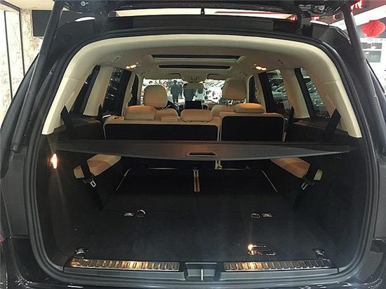 2018款奔驰GLS450全景天窗已经是这个级别SUV的标配了,天窗整体分为两个部分,前半部分可以开启,满员时,后备厢空间不算宽裕,能放两个登机箱,如果放倒第三排座椅,空间会明显提升,足以应付日常储物的需求。备厢饰板下是一个全尺寸备胎,工具也都配备齐全,以便不时之需。
