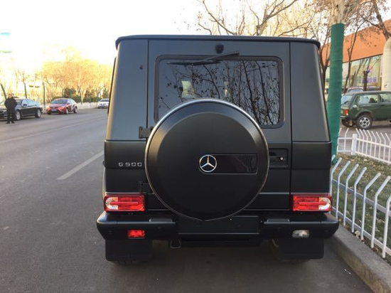 奔驰G500不过外观并不低调,劳伦士为它带来了类似AMG版本的运动包围。前保险杠被分成 了三个方形的进气口。轮圈则装上了和AMG款式相近的大五星款式,并采用黑色设计,加上整个黑色的 车身,流露出霸气的气质,这套轮圈尺寸达到了22英寸,采用轻质合金打造,配上295/35 R 22的轮胎 。
