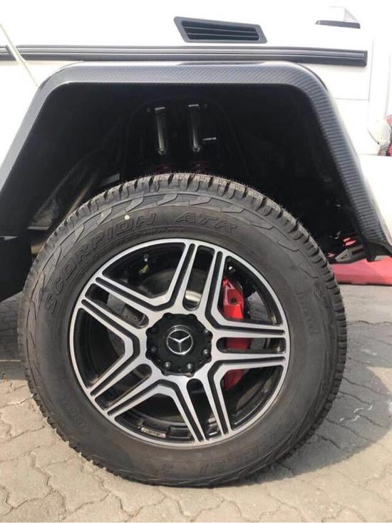 奔驰G500 4x4引擎盖上方追加了大面积轻量化碳纤维材质组件,并在两侧追加了同为碳纤材质的空力套件,搭配车身大型轮拱同样碳纤维材质的设定,并刻意透出半截碳纤维材质的迷人纹路,让外观更显凶悍。轮圈则装上了和AMG款式相近的大五星款式,并采用黑色设计,加上整个黑色的车身,流露出霸气的气质,这套轮圈尺寸达到了22英寸,采用轻质合金打造,配上295/35 R 22的轮胎。