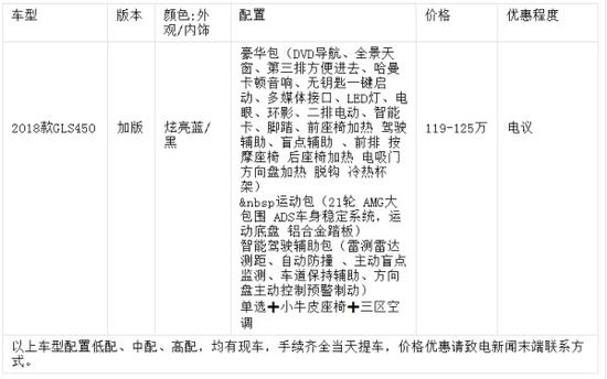 新闻内容当中炫亮蓝为实车实际拍摄,手续齐全,客户可当天办理完提车手续。这台奔驰GLS450属于高配版本,其中包括选配了雷达测距,其主要功能(自动刹车,自适应巡航,自动防碰撞预警。)选配了21英寸的多幅式运动轮毂,内饰选配了小牛匹,座椅选配了加热通风。下面表格中有详细配置分解。