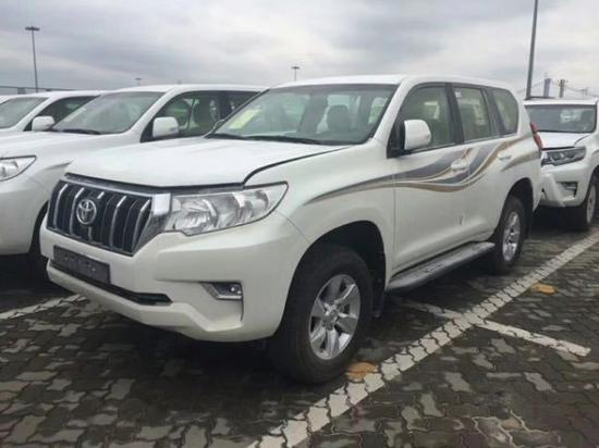 配置:18款霸道2700卡塔尔版,后挂备胎,6前速,两气囊,电动折叠后视镜,7座,丝绒座椅,胎压监测,倒车摄像,车身彩条,定速巡航,车载冰箱,后4眼雷达,前后独立调节空调,多功能真皮方向盘,蓝牙电话音乐连接,黑色脚踏板,17寸铝合金轮廓