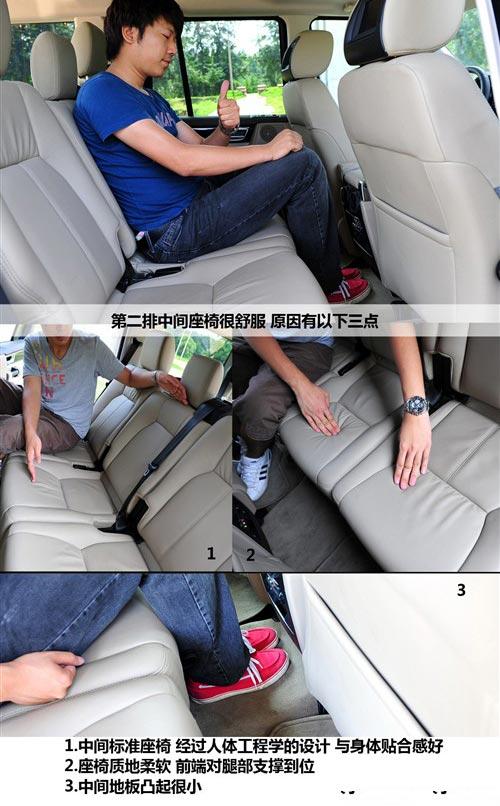 第二排纵向空间没有我们想象的出色,头部两拳的距离很充裕,这得益于阶梯式车顶的设计,但是腿部距前排靠背的距离为4指,实话讲,水平一般,也许是考虑到了第三排乘客的乘坐感受。第二排座椅很舒服,皮质柔软,但是如果中间能有个扶手会更舒服。