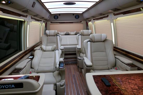 丰田考斯特12座改装商务车在内饰的规划上上既突出了时髦的元素同业也十分重视舒适性和实用性的考量,在内饰的规划上也愈加重视颜色的调配。丰田考斯特内饰的座椅的挑选上有许多中不同的方案,因为原车的座椅装备较为简单,所以丰田考斯特改装12座能够增加真皮座椅,真皮的颜色有米色和棕色红色等等多种。内饰的座椅的布局也是我们依据自己的需要进行规划。