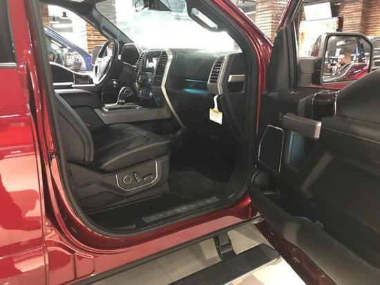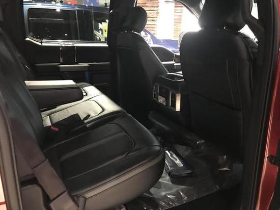 17款福特F150配备标准独特的皮革和布艺装饰的座椅,驾驶员侧的电动十向调节。这些座椅同时具备记忆功能。猛禽的内饰采用独特的中控台和门饰板面漆和真皮包裹的方向盘。猛禽可以单独选装豪华套装,豪华套装中包括了大量的舒适性的技术,比如:座椅的通风加热等。