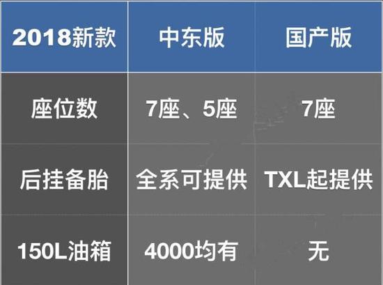 在改款前,双方还有备胎位置和座位数的差别,国产版老款不提供后挂备胎,并且中低配型号不提供7座,导致不少消费者转而选择中东版。但这次改款后,国产版也开始提供后挂备胎,并且全系标配7座,双方在这两项上的差别基本被抹平了。除此之外,两者区别还有,中东版配有150升的大油箱,而国产版全系都是小油箱。