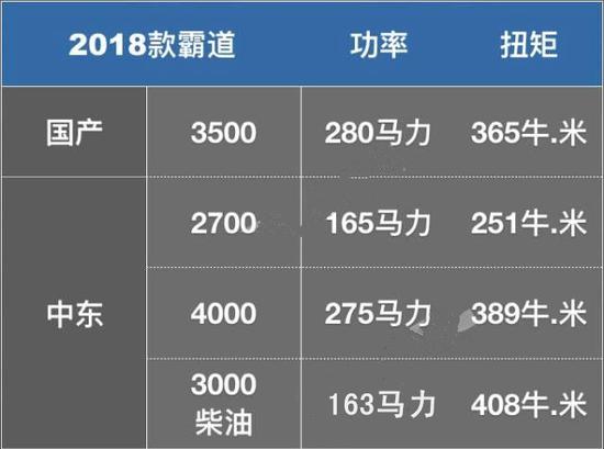 三、中东版和国产版有何差别?首先,第一个差别当然是动力。国产版只有3.5排量,而中东版有2.7和4.0两种,并且,新款的柴油版霸道3000,稍后应该也会进来。双方的动力参数差别,可以看这个表: