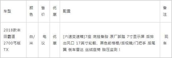 外观介绍:18款丰田霸道2700中东版依旧是宽大的镀铬进气格栅, 使整个头部看起来非常凶猛, 整体更霸气的侵略性,和更加帅气的行车表现。从车身中透射出的霸用语不足以诠释的, 大灯采用灯壳外凸设计,卓然是一位善战,18款丰田霸道2700中东版依旧是宽大的镀铬进气格栅, 使整个头部看起来非常凶猛, 整体更霸气的侵略性,和更加帅气的行车表现。从车身中透射出的霸用语不足以诠释的, 大灯采用灯壳外凸设计,卓然是一位善战的猛士。清晰而锐利的腰线、 外凸的前后翼子板则显示了它的另一种特性——肌肉感和运动感。购车咨询热线在文章最底部↓↓↓购车咨询热线在文章最底部↓↓↓18822255928(电话及微信) 陈经理