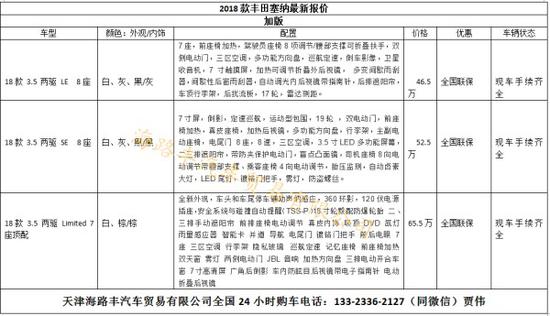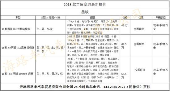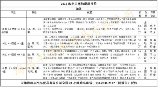 2018款丰田塞纳本周最新行情,(仅供参考,价格近期上下有浮动,具体价格请致电新闻末端联系方式)