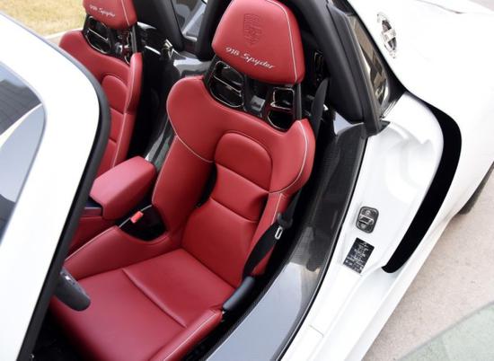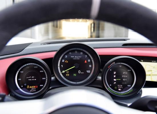 作为一辆天价跑车,918内饰提供多种选配。今天这台则是石榴红+银色饰边的内饰方案之一,偏向华贵和精致,中控台采用的是镂空设计,中控面板底下存在一块巨大的空间。保时捷在这个位置上选择了用空间换格调——这个区域没有任何储物空间,取而代之的是两款限量版的铭牌。