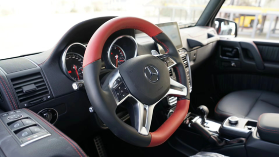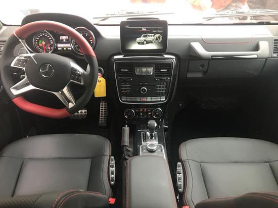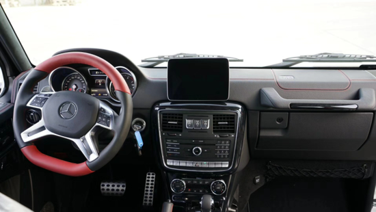 内饰方面:奔驰G550车内采用深色调与桃木装饰,黑色真皮运动座椅非常舒适,方向盘以高档真皮包裹装饰,触感极其细腻。配有桃木装饰的操控台,稳重大气,同时提高了整体的质感。各种功能按钮应有尽有,丝毫不次于豪华轿车的功能;后排空间非常宽敞,且后排的座椅可以折叠,以得到更宽敞的储物空间。
