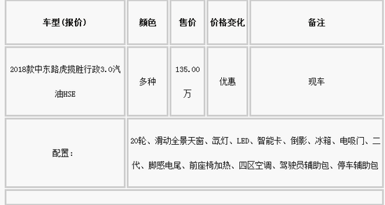 近日获悉,2018款路虎揽胜 (配置|询价)行政HSE汽油版现车到店,现车销售强仅性能所向披靡,超值爆惠限时秒杀。18款路虎揽胜行政汽油HSE完全没有前辈那种硬派的感觉,已然进化为一个超豪华全尺寸SUV。路虎摇身一变进化为全路况豪华SUV自然有它的用意, 看一看它的老对手丰田LC系列的发展就知道了。路虎新车前脸冲击感强,中网面积占据了整个前脸,并加上了镀铬装饰,营造出了路虎家族式前脸。感兴趣的朋友请进店了解更多详情或拨打文章底部咨询电话。