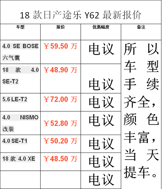 24小时贵宾咨询:131-1497-1801储昭俊(同微信)2018款途乐最大的也是最成功的举措是增加了4.0L发动机排量的途乐,比起原来最低也要5.6L排量的途乐,4.0L降途乐的起售价拉低到50万级别,且官方将途乐5.6L也降价将近30万(现指导价89.8万元),途乐价格的下降,为这款车型的热销打开了通路。从外观看途乐XE版的外观饱满厚实,线条朴实简单,没有太过流线的设计,夸张的蜂窝格栅以及粗壮的镀铬装饰条,突出了途乐的粗犷、硬朗。途乐4.0中东版前脸冲击感强,中网面积极大,基本占据了整个前脸,并加上了镀铬装饰,营造出了日产家族式前脸。