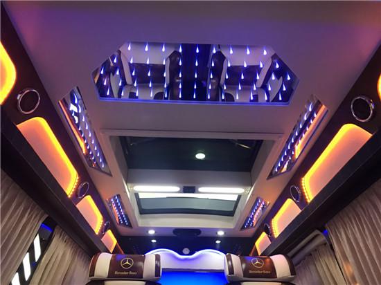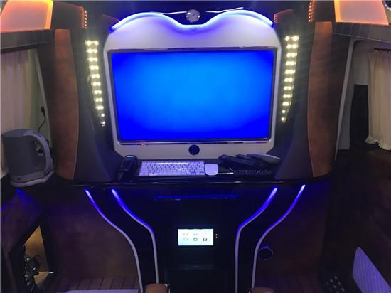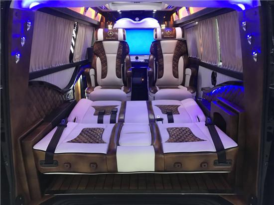 进入后舱,立刻就会被它的豪华绚丽而征服,驾驶舱与后舱是分隔设计的,形成两个独立的空间。中间由一台超大液晶升降电视(32寸)及柚木多功能吧台及柏林之声音响组成,整车环保真皮包裹,金网花地板铺设,豪华感无处不在。全部采用真皮制作,豪华木饰装点,装有按摩加热通风功能。后舱前为两个独立航空座椅,后为一组沙发座椅(可电动展平,形成一张舒适的沙发床)。