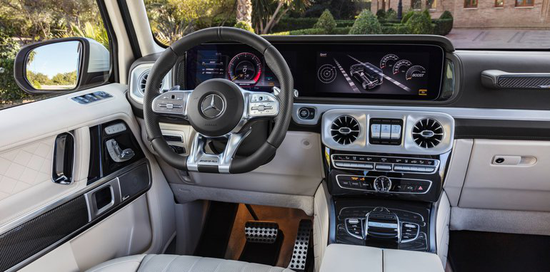 再看看配置方面,与奔驰S级 (配置|询价)和奔驰E级同款的双31cm大型车载屏幕(仪表盘以及信息娱乐系统)、15扬声器的Burmester环绕音响系统、64色内部照明系统以及全景天窗。同时,梅赛德斯AMG G63还配置了Nappa皮革的加热座椅、AMG特有的IWC品牌大钟。