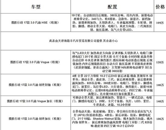再来看下 这个中东的 分 HSE Vogue 以及 Vogue加长 具体的配置 以及价格都有体现 相比之下 中东的109性价比挺高的。