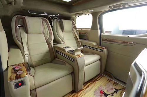 丰田埃尔法18款蒙娜丽莎总裁版全车采用耐脏的米色覆盖全车,超级奢华的隔断设计,配上32寸电动车载电视、音响系统以及豪华吧台酒柜,让埃尔法变成了一款商务休闲一体车,豪华感与科技感瞬间爆棚。清新自然的仪表台加上桃木元素的点缀,个性十足。原厂进口的小牛皮包裹着主/副座椅,高档的皮革大大提升了舒适体验。中控台上高质感的镀铬条与木纹饰板搭配得当。