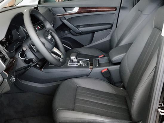 内饰方面:2018款奥迪Q5舒适型中控台上方采用大面积软性材料覆盖,同时与人体能接触部位几乎全采用真皮包裹,在副驾驶前方及中控台下方还应用了原木材料进行装饰,营造出较强的豪华感。它换装了新样式的方向盘及握感更佳的换档手柄,仪表盘进行了铝制镶边处理,同时采用了最新一代MMI多媒体信息交互系统。并且,增加了棕色条纹白橡木饰条供消费者选装。三辐式多功能方向盘及仪表盘的样式与奥迪其他车型造型保持一致,方向盘下方的换挡拨片在一定程度上能增添驾驶乐趣。
