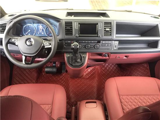 大众T6的驾驶舱一贯的大众家族风格,实木拼接、真皮包裹的方向盘,豪华红配色,时尚的感觉立现!正副驾驶位之间配置车载压缩机式大容量冰箱,并两个水杯卡槽,人性化设计的同时还保证了驾驶舱内的空间,依旧宽敞。
