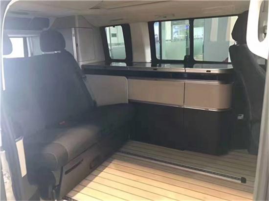 不仅如此,车内载有厨柜组合,由一个大抽屉和两个小抽屉组成,外加一个大储藏阁,带滑动门。车后还提供了一个衣柜,也带滑动门,并配有镜子。还有与其配套的30L的水槽和40L的废水槽、冰箱和煤气炉、折叠式的餐桌餐椅和衣柜等。后排座椅为电动调节机制的坐/卧两用沙发床。需要就寝时,后排的双人座椅可以电动控制展开,变成一张独立的单人床,或者一张2.03米×1.13米的大双人床。后排座椅还可以稍稍向上抬起,以保证睡眠舒适度。下方和后方是收纳箱,可以用于储存一些工具物品。