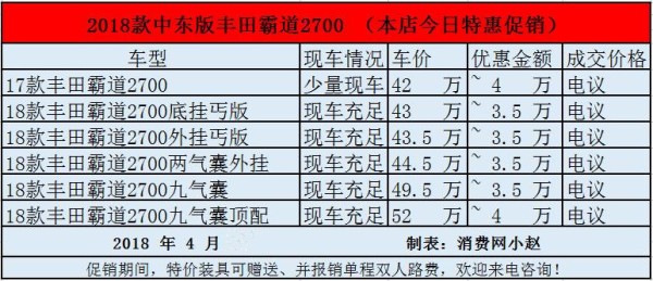 新款2018款中东版丰田霸道2700的前脸看起来十分凶猛,全新设计的直瀑式前格栅让新普拉多 (配置|询价)显得比上一代车型还要粗犷,配合全新的保险杠使其前脸更加饱满。新款18款中东版霸道 2700TX/VX现车配置齐全,月底冲量热卖,市场最低价,欢迎新客户进店选购。