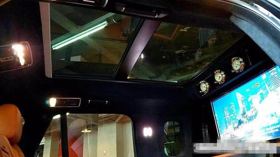 此款车配备了全景天窗,视野更好,当然电动遮阳帘也是必不可少的。电视上方则是三个航海时钟,显示着时间,温度等参数。