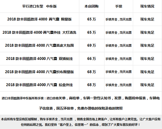 2018款兰德酷路泽4000乞丐版(五座),酷路泽4000天窗版-大灯清洗版-摇起版-气泵版-双差版-熏黑大灯版-后挂版[七座手续][五座手续],多款配置颜色,近期购车优惠万元,18款兰德酷路泽4600,酷路泽5700,全部现车,手续齐全,全国可办理银行分期付款。